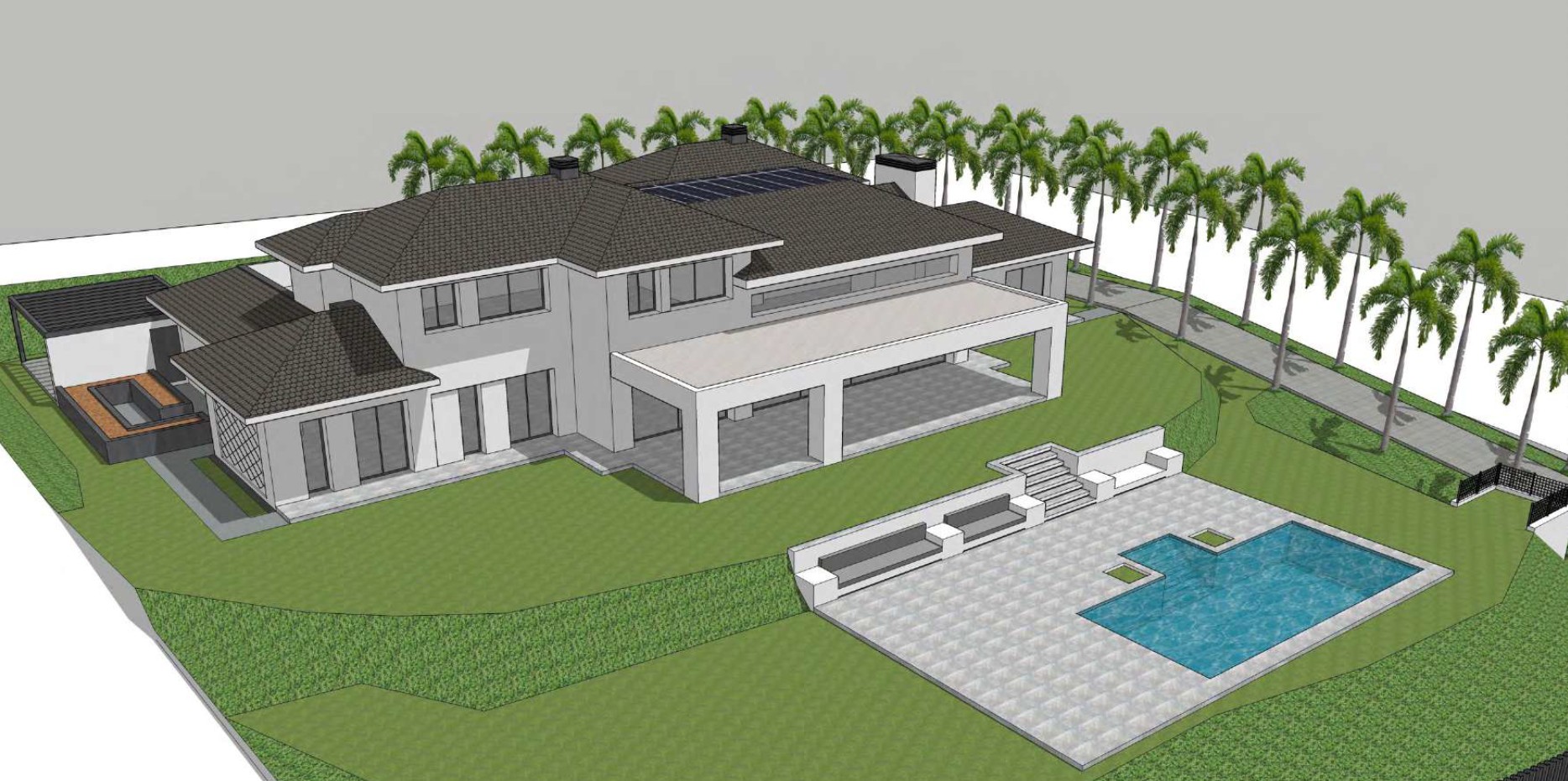 The projected house has five double bedrooms with bathroom (suite), living room, dining room, kitchen/dining room, guest toilet, pantry, laundry room, parking for four cars and a swimming pool. The master bedroom has its own bathroom, dressing room and office.