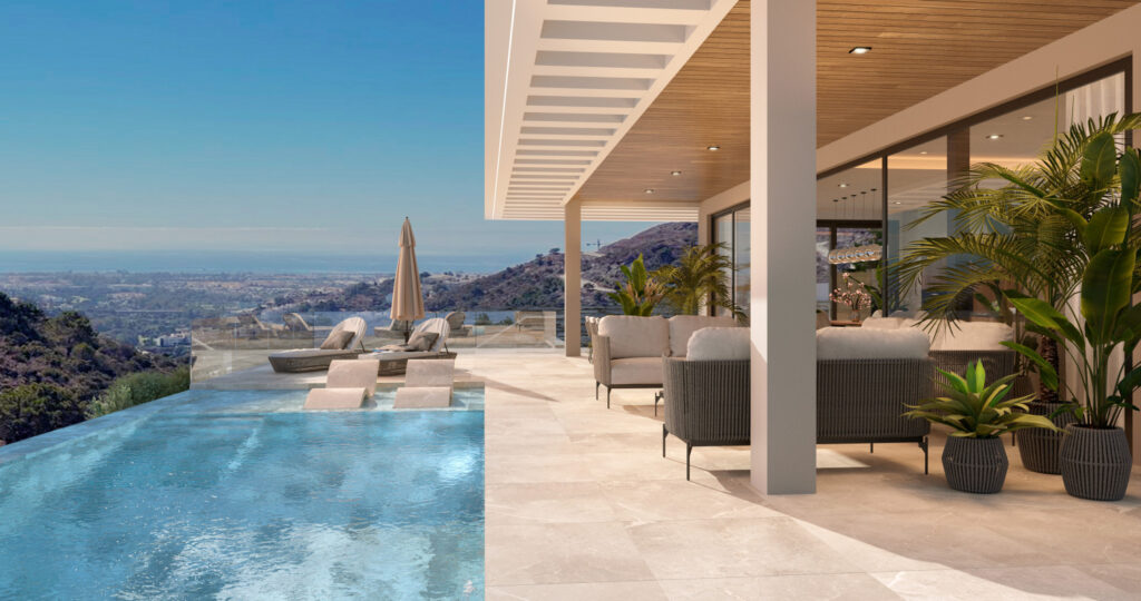 Step outside to a large terrace with panoramic views of the Mediterranean. The outdoor area includes an infinity pool crafted from Indonesian stone, known for its natural water-purifying properties. Luxurious sunbeds, a spacious dining area, and a stylish chill-out lounge provide the perfect setting for entertaining or simply enjoying the Costa del Sol sunshine.