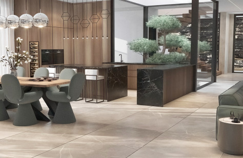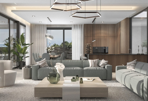 The villa’s interior design showcases striking architectural elements, including two glass cubes that create unique open spaces, one of which features a beautiful olive tree — an elegant focal point ideal for quiet relaxation or enjoying a shisha. Expansive floor-to-ceiling windows fill the home with natural light while offering solar protection to maintain a comfortable indoor climate throughout the year.